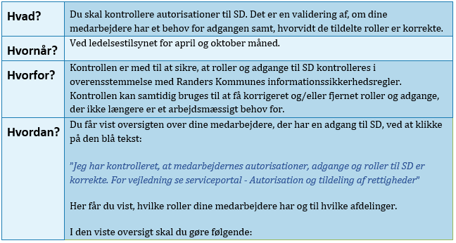 Som leder i Randers Kommune skal du 2 gange årligt foretage en dokumenteret gennemgang af dine medarbejderes autorisationer til SD, som skal bestå af både en validering af, om hver enkelt medarbejder har et behov for adgang samt, hvorvidt de tildelte roller er korrekte.